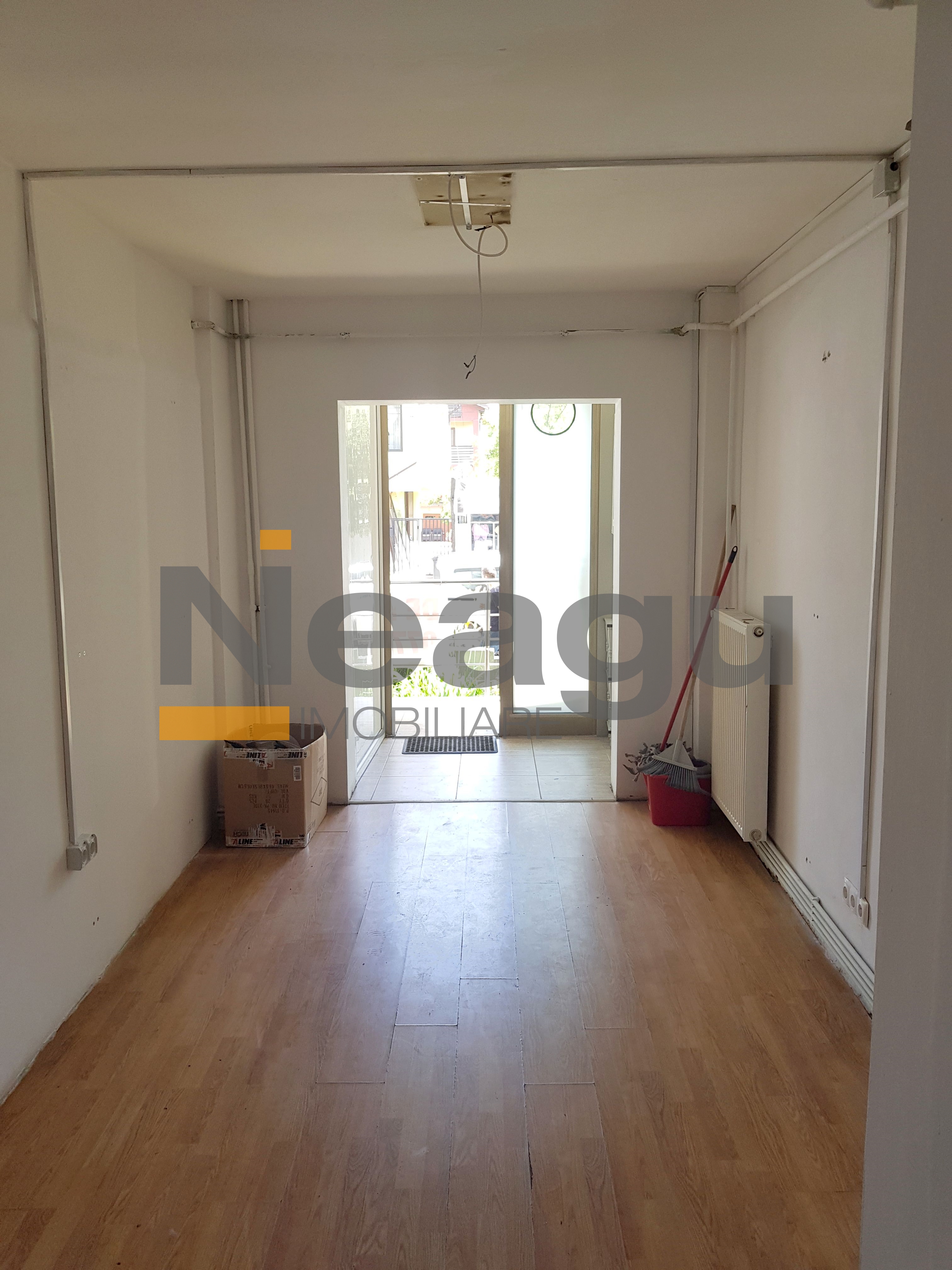 In prezent imobilul este impartit in doua spatii delimitate de un perete provizoriu din rigips care se poate darama usor, ramanand un singur spatiu mare open space.